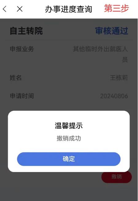 異地就醫(yī)備案成功后,點擊首頁【我要查】-【辦事進度查詢】模塊,在【辦事進度查詢】中選擇已審核通過的需要撤銷的備案信息,點擊【撤銷】,彈出撤銷成功即可。